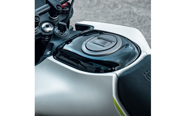 Palivová nádrž s objemem 13 litrů zajišťuje dostatečný dojezd pro městské i víkendové výlety. Tvar nádrže je navržen pro pohodlné uchopení koleny při sportovní jízdě. Nádrž je umístěna nízko a centrálně pro optimální rozložení hmotnosti a nízké těžiště. Hliníkový uzávěr nádrže s logem Husqvarna zdůrazňuje prémiovou kvalitu. Povrchová úprava nádrže je odolná proti poškrábání. Design nádrže dokonale ladí s celkovým minimalistickým stylem motocyklu.