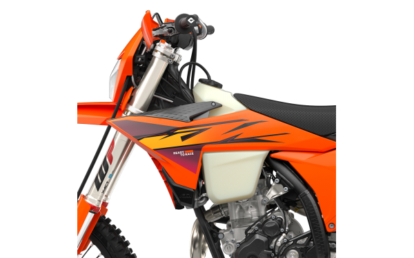 Průhledná polyetylenová palivová nádrž je charakteristickým prvkem řady KTM EXC-F. Po důkladném testování na závodech od GNCC až po nejtěžší FIM hard enduro závody jsou tyto nádrže postaveny opravdu jako tanky! Jednodílné palivové čerpadlo a filtr řídí přívod paliva, zatímco servis je velmi jednoduchý díky snadnému přístupu k palivovému filtru. Nová nádrž o objemu 8,5 litru je navržena tak, aby maximalizovala spotřebu paliva a zároveň se dokonale integrovala s ergonomickými plasty.