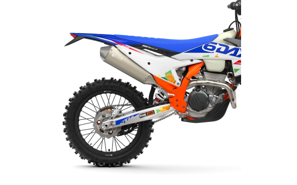 Poskytující štěkot pro kousnutí řady KTM EXC-F 6DAYS, výfukový systém je navržen tak, aby poskytoval tvrdě bijící výkon při nejnižší možné hmotnosti. Dvoudílný design hlavní trubky je vyroben tak, aby byl co nejkompaktnější, s vedením hlavní trubky extrémně blízko motoru pro maximální centralizaci hmot a minimální vystavení kamenům. Na konci produkujícím hluk je krátký, kompaktní tlumič vyrobený z lehkého hliníku a dokončený v unikátní antracitové barvě 6DAYS, hrdě zobrazující logo 6DAYS.