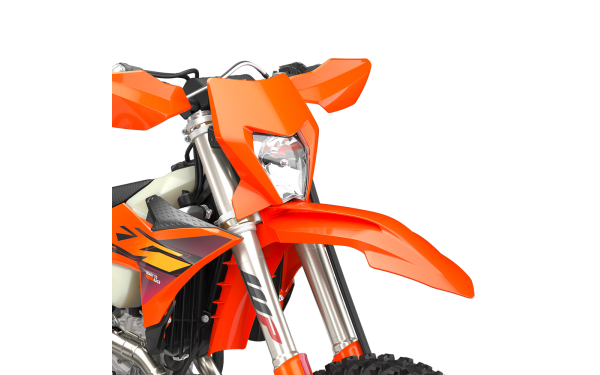 Řada KTM EXC-F dostává svěží barevnou aktualizaci. Dominantní oranžová barva je doplněna odstíny tmavě fialové a červené, což vytváří unikátní a ultra READY TO RACE vzhled. Veškerá grafika zůstává na svém místě díky in-mold technologii, zatímco sedlo je vybaveno vysoce přilnavým potahem v černé barvě se stejnou texturou, která je sdílena s ochrannými kryty rámu, bočními kryty nádrže a polstrováním řídítek.