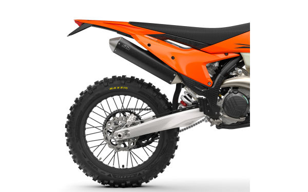 Přinášíme Braaap! Díky kompaktnímu motoru KTM 250 XC-W je hlavní trubka navržena s cílem dosáhnout větší světlé výšky a snížit riziko poškození při jízdě přes hluboké kořeny, koleje nebo při zdolávání strmých skal. Tlumič je vyroben z lehkého hliníku.