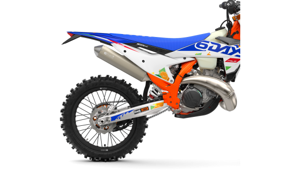Přinášíme Braaap! Díky kompaktnímu motoru KTM 300 EXC 6DAYS je hlavní trubka navržena s cílem dosáhnout větší světlé výšky a snížit riziko poškození při jízdě přes hluboké kořeny, koleje nebo při zdolávání strmých skal. Tlumič je vyroben z lehkého hliníku a je stylově dokončen v antracitové barvě s logem 6DAYS.
