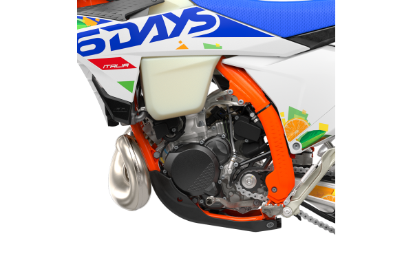 Speciálně konstruovaný pro podélnou tuhost, řada KTM EXC 6DAYS je postavena kolem lesklého oranžového práškově lakovaného rámu poskytujícího výjimečnou zpětnou vazbu jezdci, absorpci energie a stabilitu při vysokých rychlostech. Toho je dosaženo změnou umístění rotujících hmot v rámu spolu s zpevněním rámu v místě připojení hlavy řízení. Úchyty stupaček jsou zapuštěny do rámu pro štíhleší design a pro menší riziko zachycení. Když jízda skončí, kovaný jednodílný boční stojánek zajišťuje, že váš enduro stroj stojí hrdě.