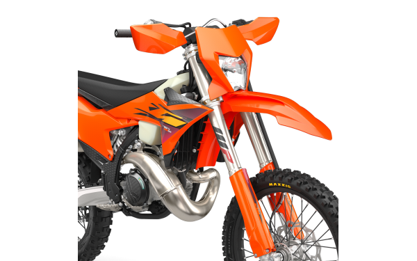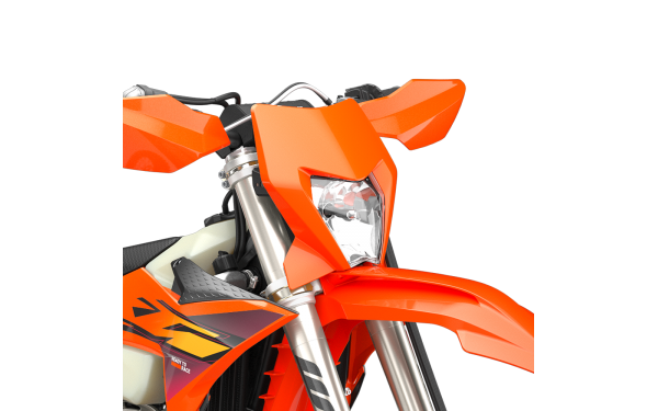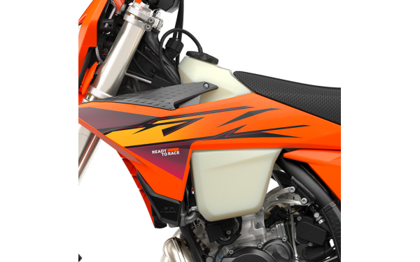 Řada KTM EXC dostává svěží barevnou aktualizaci. Oranžová dominuje barevné paletě, ale odstíny tmavě fialové a červené se také objevují, vytvářející unikátní, ale ultra READY TO RACE vzhled. Jako vždy všechny grafiky zůstávají na místě díky technologii in-mold, zatímco sedlo obsahuje vysoce přilnavý potah sedla v černé barvě se stejnou texturou sdílenou napříč ochrannými kryty rámu, bočními kryty nádrže a chrániči řídítek.