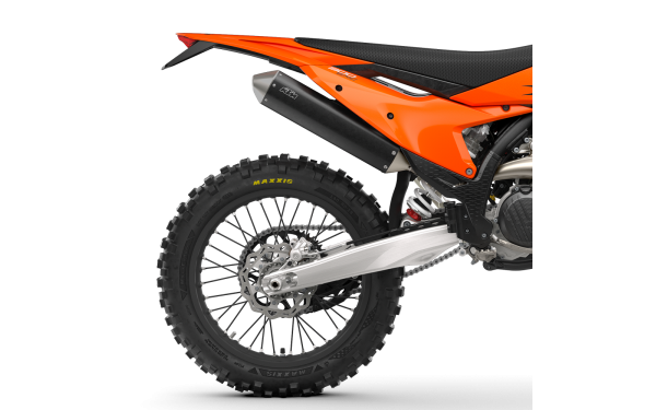 Přinášíme Braaap! Díky kompaktnímu motoru KTM 300 EXC je hlavní trubka navržena s cílem dosáhnout větší světlé výšky a snížit riziko poškození při jízdě přes hluboké kořeny, koleje nebo při zdolávání strmých skal. Tlumič je vyroben z lehkého hliníku.
