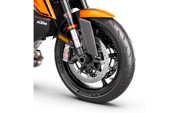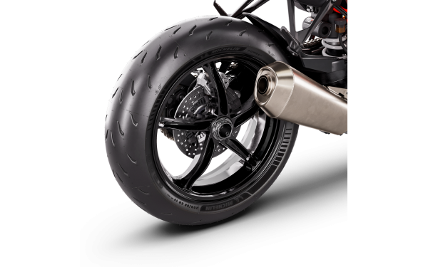 KTM 1390 SUPER DUKE R je standardně vybaven lehkými pneumatikami MICHELIN Power GP. Díky technologii dual compound tyto pneumatiky poskytují vylepšený grip jak při akceleraci v přímém směru, tak důležitěji při náklonu. Nejenže slibují výjimečný výkon na okruhu, ale nabízejí také vynikající chování na silnici jak za mokra, tak za sucha. Litá hliníková kola 3,50 x 17" vpředu a 6 x 17" vzadu jsou navržena pro optimální tuhost a nízkou hmotnost. Kombinace kol a pneumatik poskytuje precizní řízení a vynikající zpětnou vazbu.