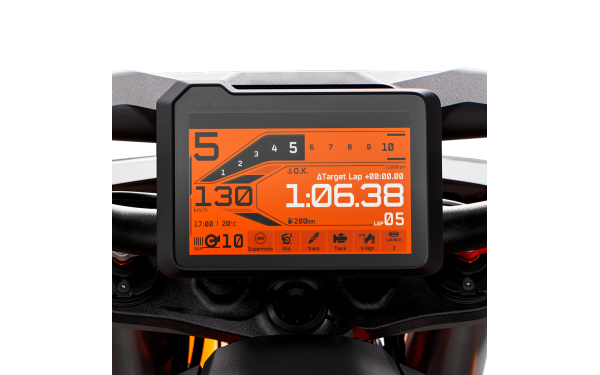 Moderní 5" TFT displej s bonded glass poskytuje rychlý přístup k různým funkcím motocyklu s mnohem menším počtem kliknutí. Displej funguje ve spojení s volitelným KTMconnect, který propojuje váš smartphone pro přístup k navigaci, audio a hovorům. K dispozici je také USB-C připojení pro nabíjení vašeho chytrého zařízení. Displej nabízí vynikající čitelnost za všech světelných podmínek a intuitivní menu umožňuje snadnou navigaci mezi funkcemi. Grafika je čistá a přehledná, s důrazem na klíčové informace.
