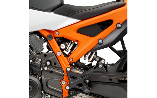 Stupačky KTM 990 DUKE R jsou navrženy pro maximální grip a precizní kontrolu. Povrch zajišťuje spolehlivý úchop i při extrémních úhlech náklonu nebo v mokrých podmínkách. Pozice stupačky je optimalizována pro sportovní jízdu a umožňuje jezdci zaujmout agresivní pozici při útoku na zatáčky. Robustní konstrukce zajišťuje dlouhodobou odolnost i při náročném používání. Stupačky jsou umístěny tak, aby poskytovaly ideální ergonomický trojúhelník v kombinaci se sedlem a řídítky, což zajišťuje maximální kontrolu a pohodlí při sportovní jízdě.