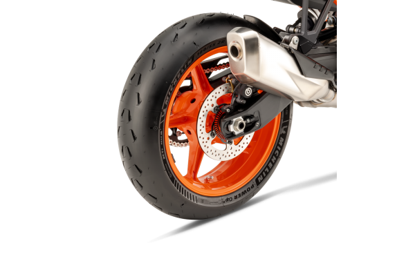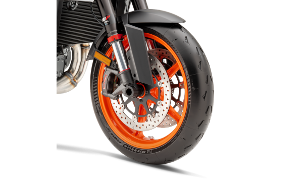KTM 990 DUKE R je osazen litými hliníkovými koly o průměru 17" na obou koncích, které poskytují ideální rovnováhu mezi pevností a nízkou hmotností. Přední kolo má šířku 3,5", zatímco zadní kolo má šířku 5,5" pro optimální přenos výkonu na silnici. Tato kombinace zajišťuje vynikající přilnavost v zatáčkách a stabilitu při vysokých rychlostech. Lehká litá kola přispívají k nízké neodpružené hmotnosti, což zlepšuje odezvu odpružení a celkovou agilitu motocyklu. Prémiové pneumatiky poskytují špičkový grip a stabilitu jak na suchém, tak mokrém povrchu.