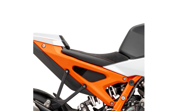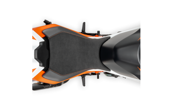 Sedlo KTM 990 DUKE R je navrženo tak, aby poskytovalo ideální rovnováhu mezi sportovním výkonem a komfortem. S výškou 840 mm umožňuje snadné dosažení na zem při zastavení, zatímco tvar sedla je optimalizován pro aktivní jízdu a rychlé přesuny hmotnosti. Povrch sedla poskytuje dostatečný grip pro bezpečné uchycení při agresivní akceleraci a brzdění. Kompaktní design sedla přispívá k celkové štíhlosti motocyklu a umožňuje jezdci snadno měnit pozici podle jízdní situace. Toto sedlo je ideální pro sportovní jízdu, ale zároveň poskytuje dostatečný komfort pro delší výlety.