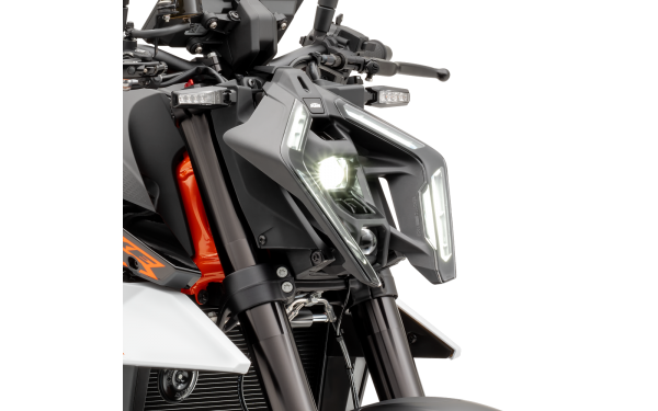 Když se den změní v noc, dynamický lehký LED světlomet vybavený na KTM 990 DUKE R slouží svému konečnému účelu, a to s chytrým dotekem. Denní svícení se automaticky přizpůsobuje intenzitě a funkci v tmavších podmínkách, automatické potkávací světlo nabízí asistenci tím, že zůstává rozsvícené ještě chvíli i po dokončení jízdy, a jeho vylepšení jsou jasná. LED technologie poskytuje jasnější a efektivnější osvětlení s nižší spotřebou energie ve srovnání s tradičními halogenovými světlomety. Výsledkem je lepší viditelnost za všech podmínek a větší bezpečnost při jízdě v noci nebo za špatného počasí.