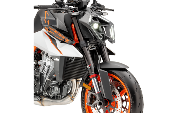 KTM 990 DUKE R je agresivní svou povahou a s písmenem 'R' na bočních spoilerech nádrže, které okamžitě signalizuje jeho špičkové DNA, jezdci okamžitě rozpoznají THE PUNISHER na první pohled. Čerpající inspiraci z různých historických modelů v řadě KTM a povyšující konečný výsledek tak, aby splňoval moderní požadavky, je bílé barevné provedení stejně cool, jako je odvážné - při rychlosti i ve stání. Design kapotáže je optimalizován pro minimální hmotnost a maximální aerodynamickou účinnost, zatímco zároveň poskytuje charakteristický naked bike vzhled. Kompaktní tvar a agresivní linie podtrhují sportovní charakter tohoto stroje.