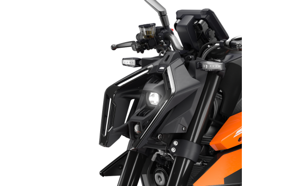 Zcela nový lehký design LED světlometu dodává KTM 990 DUKE hrozivý vzhled a zároveň mění noc v den. Denní svítící světla automaticky upravují intenzitu podle okolního osvětlení a automatické potkávací světlo zůstává rozsvícené ještě chvíli po ukončení jízdy. LED světla na KTM 990 DUKE nejen propalují díru do temnoty, ale jsou také chytrá a funkční.