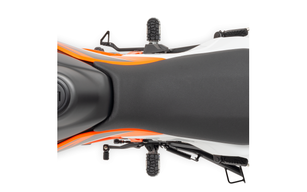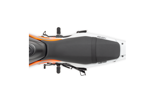 KTM 125 SMC R je vybaven novým plochým jednodílným sedlem s výškou 860 mm, které čerpá inspiraci z řady KTM EXC, ale s přidaným komfortem pro delší dojíždění nebo výlety. Tento design sedla umožňuje snadnou mobilitu na motocyklu a usnadňuje dosažení nízkého těžiště při projíždění zatáček s kolenem u země. Tvar sedla je optimalizován pro rychlé přesuny hmotnosti a aktivní jízdu, což je klíčové pro supermoto styl. Výška sedla 860 mm poskytuje ideální rovnováhu mezi kontrolou a pohodlím, zatímco štíhlý profil umožňuje snadné dosažení na zem při zastavení, což oceníte zejména při učení se supermoto technikám.