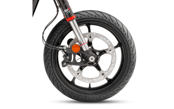 KTM 125 SMC R je vybaven radiálním brzdovým kotoučem o průměru 320 mm s Bybre třmenem vpředu a 240 mm brzdovým kotoučem s jednopístkovým třmenem vzadu. Tyto komponenty jsou podporovány osvědčenou technologií ABS od KTM pro zvýšenou bezpečnost - ale zadní brzdu lze také zcela deaktivovat pro přidanou "SuperMoto-zábavu". Tento brzdový systém zajišťuje vynikající brzdný výkon s precizním dávkováním, což je klíčové pro supermoto styl jízdy. Možnost vypnutí zadního ABS umožňuje kontrolované smyky a drifty, které jsou charakteristické pro supermoto jízdu a ideální pro učení se pokročilým technikám.