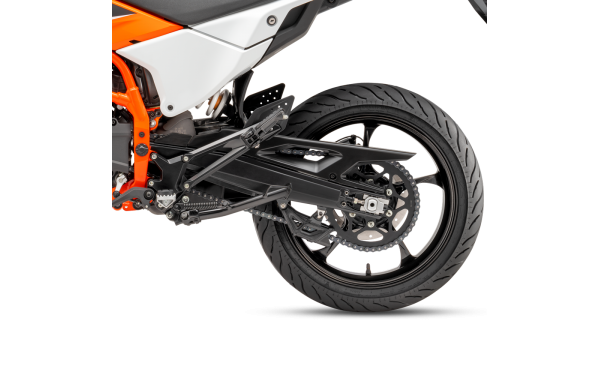 Kyvná vidlice byla speciálně vyvinuta pro KTM 125 SMC R metodou gravitačního lití a poskytuje robustní a odolnou platformu pro systém zadního odpružení. S přímou montáží tlumiče posunutou do strany vytváří dodatečný prostor pro jedinečný výfukový systém. Tento design kyvné vidlice umožňuje optimální montážní pozici zadního tlumiče, což zajišťuje progresivní charakter odpružení. Proces odlévání z jednoho kusu eliminuje jakékoli nesrovnalosti a slabá místa, která by byla vlastní svařované kyvné vidlici. Výsledkem je lehká, tuhá a spolehlivá konstrukce.