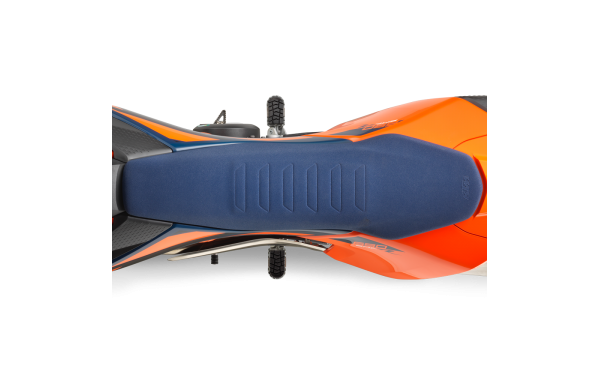 KTM 690 SMC R je vybaven sedlem s výškou 899 mm a ultra-gripovým potahem, který dokonale ladí s výrazným designem motocyklu. Potah sedla má také speciální texturu pro supermoto, která spolupracuje s koženými závodními kombinézami a poskytuje grip a neomezený pohyb jezdce při agresivních manévrech. Tvar sedla je optimalizován pro rychlé přesuny hmotnosti a aktivní jízdu, což je klíčové pro supermoto styl. Výška sedla 899 mm poskytuje ideální rovnováhu mezi kontrolou a pohodlím, zatímco štíhlý profil umožňuje snadné dosažení na zem při zastavení.