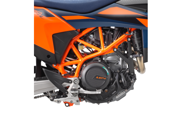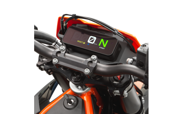 Vítejte u nejnovější generace legendárního jednoválcového motoru KTM LC4! Stále stejně neprůstřelný a razantní jako vždy, ale aktualizovaný s novými kryty spojky a statoru, zcela novou klikovou skříní, vylepšeným systémem dodávky oleje a - což je nejdůležitější - vyšším výkonem. Motor o objemu 692,7 cm³ produkuje 79 koní a točivý moment 73 Nm, což poskytuje dostatek síly pro agresivní akceleraci a power-wheelies. Pokročilý systém řízení motoru Keihin EMS s ride-by-wire a dvojitým zapalováním zajišťuje optimální spalování, okamžitou odezvu na plyn a precizní kontrolu výkonu v každé situaci. Kapalinové chlazení udržuje motor v optimálním teplotním rozsahu i při náročné jízdě.