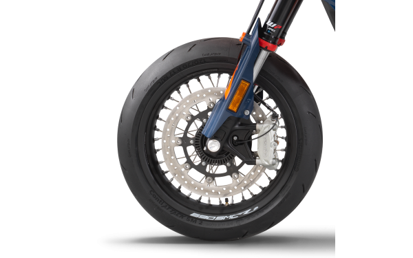 Na předním kole je namontován osvědčený brzdový třmen BREMBO M 4.32 Monoblock. Ten poskytuje špičkový brzdný výkon ve své třídě, který je kombinován s lehkými kotoučovými brzdami - průměr 320 mm vpředu a 240 mm na zadním kole - a vytváří klíčovou kombinaci brzdného výkonu a konzistentního pocitu z brzdy. Tento prémiový brzdový systém zajišťuje precizní dávkování a vynikající výkon při agresivním brzdění do zatáček, což je klíčové pro supermoto styl jízdy. Systém poskytuje jezdci maximální důvěru při tvrdém brzdění a umožňuje pozdní brzdění do zatáček s plnou kontrolou.