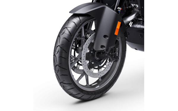 KTM 1390 SUPER ADVENTURE S je osazen novými pneumatikami DUNLOP MERIDIAN. Tyto pneumatiky disponují inovativním dezénem ve stylu "ledové sekery", který zvyšuje trakci na nezpevněných cestách a poskytuje optimální odvod vody. Zároveň nabízejí vynikající jízdní vlastnosti a stabilitu na asfaltu, což z nich činí ideální volbu pro cestování i sportovní jízdu v horských průsmycích. Rozměry pneumatik jsou 120/70 R 19 vpředu a 170/60 R 17 vzadu, osazené na litých hliníkových kolech. Systém monitorování tlaku v pneumatikách (TPMS) je standardní výbavou a průběžně kontroluje tlak v obou pneumatikách, což zvyšuje bezpečnost a pomáhá optimalizovat životnost pneumatik.