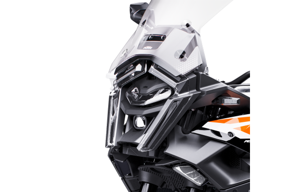 Zcela nová LED světelná jednotka zaujímá centrální pozici na KTM 1390 SUPER ADVENTURE S. Tato jednotka nejen poskytuje motocyklu výrazný a nezaměnitelný vzhled, ale také osvětluje cestu s mimořádnou intenzitou a přesností. Nové adaptivní osvětlení do zatáček automaticky přisvěcuje do směru zatáčky a poskytuje širší osvětlení, což výrazně zvyšuje bezpečnost při jízdě v noci na klikatých cestách. LED technologie nabízí vyšší svítivost při nižší spotřebě energie a výrazně delší životnost oproti konvenčním žárovkám. Světelný kužel je optimalizován pro maximální viditelnost bez oslňování protijedoucích vozidel. Více informací naleznete v sekci KTM Technologie.