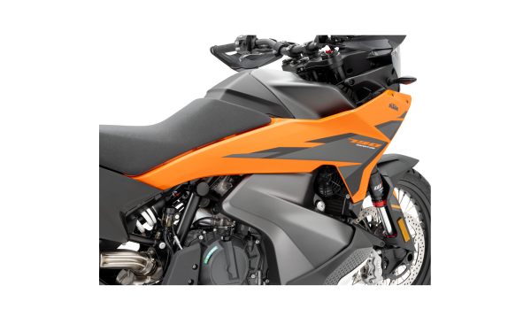 Kapotáž KTM 790 ADVENTURE je navržena tak, aby poskytovala optimální ochranu a aerodynamiku při zachování charakteristického adventure vzhledu. Kompaktní design zajišťuje snadné ovládání v terénu, zatímco robustní konstrukce chrání klíčové komponenty před nečistotami a kameny. Boční panely jsou ergonomicky tvarovány pro pevný úchop koleny při jízdě vestoje v náročném terénu. Materiály jsou vybrány pro dlouhodobou odolnost a snadnou údržbu. Celkový design kapotáže odráží DNA adventure motocyklů KTM a zajišťuje, že tento stroj vypadá stejně dobře na silnici jako v terénu.