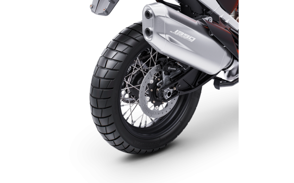 KTM 1390 SUPER ADVENTURE R je osazen skutečnou terénní kombinací kol a pneumatik s rozměry 90/90-21 vpředu a 150/70-18 vzadu, obutými do nových pneumatik BRIDGESTONE AT 41. Tyto pneumatiky nejen vypadají jako pravé terénní gumy, ale také poskytují výkon, který od nich očekáváte. Inovativní dezén s agresivními bloky zajišťuje vylepšené terénní vlastnosti a stabilitu při jízdě přes hrubý terén, zatímco na asfaltu nabízejí překvapivě dobré jízdní vlastnosti a stabilitu. Drátěná kola s hliníkovými ráfky jsou standardem v terénním segmentu díky své odolnosti proti nárazům a možnosti opravy v terénu - pokud ohnete ráfek, můžete ho často narovnat a pokračovat v cestě. Systém monitorování tlaku v pneumatikách (TPMS) je standardní výbavou a umožňuje vám přizpůsobit tlak podle povrchu pro optimální trakci.