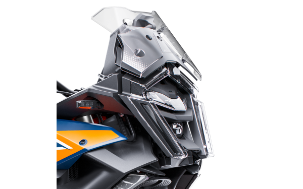 Zcela nová LED světelná jednotka zaujímá centrální pozici na řadě KTM 1390 SUPER ADVENTURE. Tato jednotka nejen poskytuje motocyklu svěží a nezaměnitelný vzhled, ale také osvětluje cestu s mimořádnou intenzitou a přesností, což je klíčové při noční jízdě v neznámém terénu. Nové adaptivní osvětlení do zatáček automaticky přisvěcuje do směru zatáčky a poskytuje širší osvětlení, což výrazně zvyšuje bezpečnost při jízdě v noci na klikatých horských cestách nebo technických terénních úsecích. LED technologie nabízí vyšší svítivost při nižší spotřebě energie a výrazně delší životnost oproti konvenčním žárovkám. Světelný kužel je optimalizován pro maximální viditelnost v terénu i na silnici, takže vždy vidíte, kam jedete. Více informací naleznete v sekci KTM Technologie.