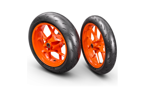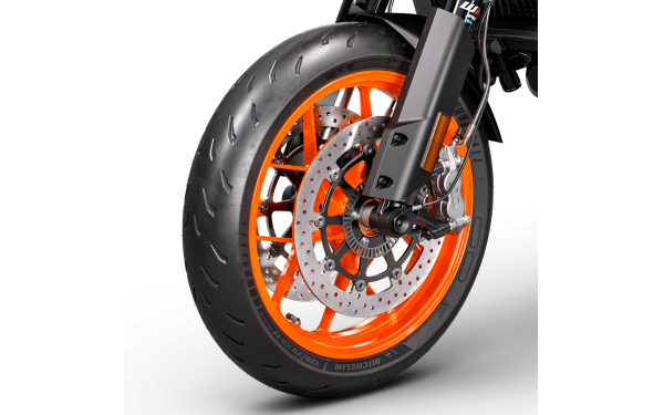 Pneumatiky Michelin PowerGP jsou navinuty kolem sady 17" lehkých litých hliníkových kol. To znamená nízké úrovně neodpružené hmotnosti a epické úrovně ovladatelnosti a jízdní dynamiky. Tato kombinace zajišťuje vynikající přilnavost v zatáčkách a stabilitu při vysokých rychlostech. Prémiové pneumatiky Michelin PowerGP nabízejí špičkový grip a stabilitu jak na suchém, tak mokrém povrchu, což z KTM 890 SMT činí ideálního společníka pro sportovní touring jízdu po horských silnicích.